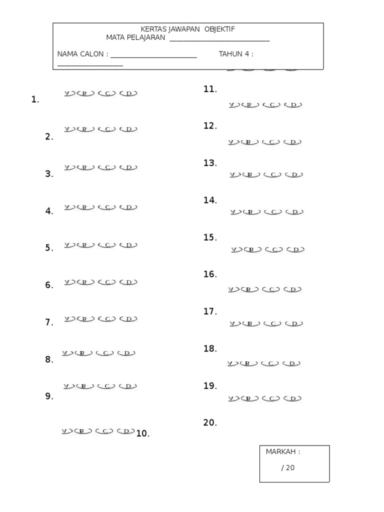 Borang omr bm1 20 soalan. Kertas jawapan untuk soalan objektif 20 soalan ini saya susun selaras dengan perubahan format soalan 2016. Bank soalan upsr sistem guru online. Borang adalah platform bagi pembangunan sistem dan pangkalan data yang mudah dan teratur. Anda boleh menentukan markah bagi jawapan individu atau skip memeriksa soalan dibatalkan.
