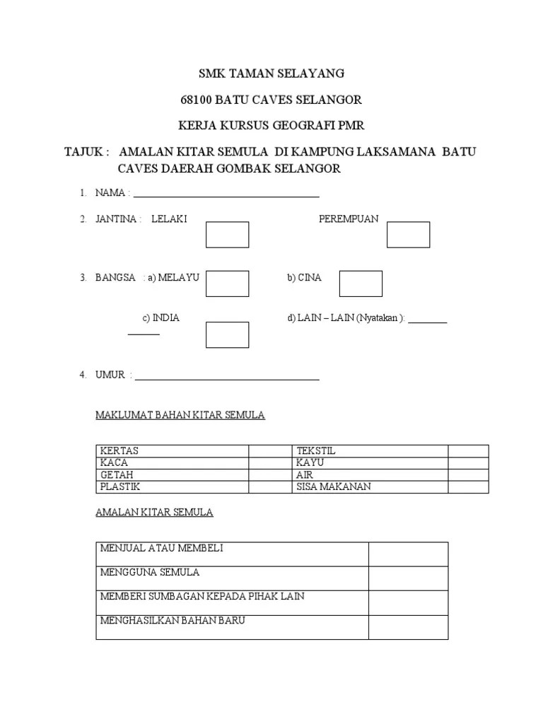Tajuk kajian 'guna tanah di kawasan kajian anda' telah dipilih sebagai tugasan yang wajib disiapkan oleh setiap calon pt3 pada tahun 2018. Menyediakan borang keaslian kajian lampiran 4. Dalam penyelidikan penggunaan borang soal selidik adalah satu kaedah saintifik yang penting dalam membuat pengumpulan data. Sisa domestik contoh borang soal selidik geografi tingkatan 1. Koperatif dalam pembelajaran dan pengajaran sains d. Soal selidik untuk mengkaji pembentukkan masyarakat majmuk melalui perkahwinan di kawasan sekitar shah alam. Please fill this form, we will try to respond as soon as possible. Contoh borang soal selidik geografi tentang sisa domestik. Kajian kes di bandar batu pahat, johor. Panduan buat calon pt3 yang sedang membuat satu tugasan kerja kursus geografi pt3 tahun 2018. ( ) lelaki ( ) perempuan 2) umur report borang soal selidik. Geografi tingkatan 3 pembuangan sisa domestik di kampung melayu subang, shah alam, selangor. Contoh soalan soal selidik pencemaran udara selangor c trainees2013 contoh soalan borang soal selidik geografi borang soal selidik geografi sisa domestik guru paud.