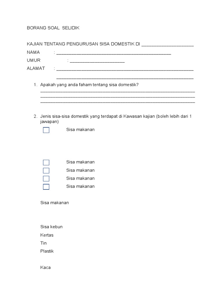 Related : Borang Soal Selidik Sisa Domestik : Contoh borang soal selidik geografi tentang sisa domestik..